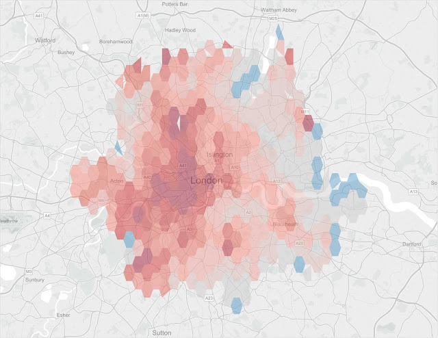 [6] There is a lot more to be done with this dataset. In case you wonder, the colour scale is set so that below-average prices are blue and above-average prices are red. The very dark red hexes in central London are areas where average prices paid in 2014 were more than 4 times higher than the national average.